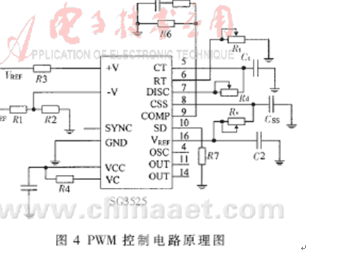 在以IGBT設計的逆變電源中,PWM控制電路是極其重要的組成部分,SG3525脈寬調制型控制器作為SG3524的改進型,更適合于開關器件的雙端DC-DC變換器,它的外圍電路原理圖如圖4所示,輸出波形如圖5所示。