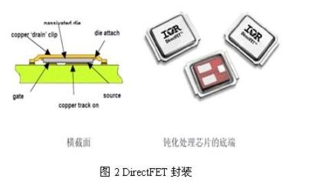 DirectFET的硅芯片封裝在一個銅外殼中。封裝的底部由一個特殊設計的芯片所組成,源極和柵極接觸襯墊可以直接焊接到PC板上。硅芯片上的一個專有鈍化系統(tǒng)將柵極和源極襯墊隔離以防止發(fā)生短路,并在器件安裝于電路板之上時起一個焊接掩膜的作用。鈍化層還能夠保護端接點和柵極構造免受濕氣和其他污染影響。一個銅“外殼”從芯片的另一面形成漏極連接至電路板。該設計省去了引線框架和金屬線接點,并在占位面積與SO-8封裝相同的DirectFET封裝中將無芯片式封裝電阻(DFPR)降至0.1mΩ,而標準SO-8封裝則為1.5mΩ。