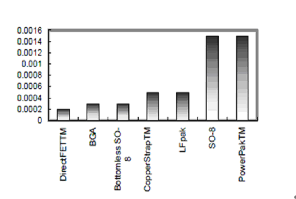 圖3顯示在目前使用的SMT器件中DirectFET封裝提供了最優(yōu)良的封裝阻抗(DFPR)。