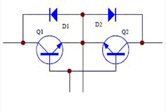 旁路開關常使用繼電器和可控硅。繼電器在中小功率的UPS 中廣泛應用。優點是控制簡單,成本低,缺點是繼電器有轉換時間,還有就是機電器件的壽命問題。可控硅常見于中大功率UPS 中。優點是控制電流大,沒有切換時間。但缺點就是控制復雜,且由于可控硅的觸發工作特性,在觸發導通后要在反向偏置后才能關斷,這樣就會產生一個最大10ms的環流電流,如圖2。如果采用IGBT,如圖3,則可以避免這個問題,使用IGBT 有控制簡單的優點,但成本較高。其工作原理為:當輸入為正半周時,電流流經Q1、D2,負半周時電流流經D1、Q2。
