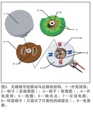 如前所述,無刷電機具有較長的壽命,并由于產生的電火花較少,也沒有了RFI干擾。無刷直流(BLDC)設計還提供業內直徑最小、厚度最薄的扁平振動馬達。圖4介紹了這種馬達的基本構造。
