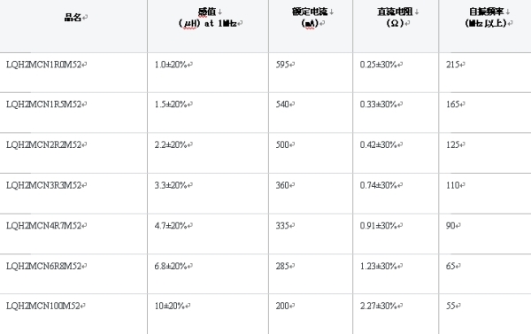 表2:LQH2MC_52系列額定表