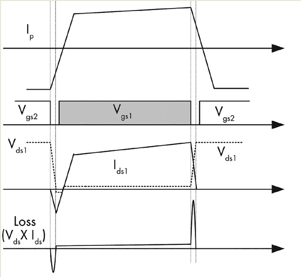 能量傳送網(wǎng)絡(luò)包含一個DC隔直電容和一個變壓器。這個網(wǎng)絡(luò)利用DC隔直電容 (CB) 消除方波電壓 (Vd) 的DC偏移,然后通過變壓器把純AC方波電壓傳送到次級端。由于存在泄漏電感,變壓器初級端電流Ip滯后于加在變壓器初級端上的電壓,這就讓MOSFET得以零電壓導(dǎo)通。如圖2所示,在其中一個開關(guān)斷開之后,Ip對MOSFET輸出電容進行充電 (或放電),最終開關(guān)電壓從一個輸入電軌變化到另一個 (從Vin到地或從地到Vin)。接著,Ip繼續(xù)流經(jīng)反向并聯(lián)的體二極管。只要體二極管導(dǎo)通,相應(yīng)的MOSFET就能夠零電壓導(dǎo)通。這種軟開關(guān)方案不僅可降低開關(guān)損耗,還能減小電磁干擾 (EMI)。