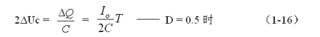 由圖1-6可以看出,在控制開關(guān)的占空比D等于0.5的情況下,電容器充、放電的電荷和充、放電的時間,以及正、負電壓紋波值均應(yīng)該相等,并且電容器充電流的平均值也正好等于流過負載的電流。因此,電容器充時,電容器存儲的電荷ΔQ為: