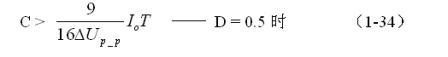同理,(1-33)和(1-34)式的計算結果,只給出了計算反轉式串聯開關電源儲能濾波電容C的中間值,或平均值,對于極端情況可以在平均值的計算結果上再乘以一個大于1的系數。