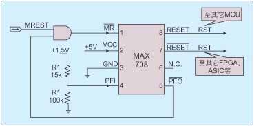 在電路設計中,MCU單元一般由51單片機構成,單片機的復位信號是高有效。一般FPGA和ASIC的復位信號都是低有效。由于MAX708可同時輸出高電平有效和低電平有效的復位信號,因此可以利用MAX708的這個特點來解決電路內MCU、FPGA、ASIC的上電復位問題。