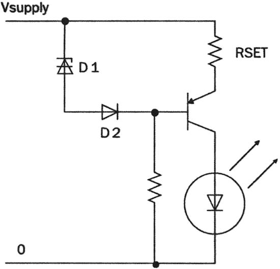 相對簡單的方案是使用線性降壓穩壓器(圖1),D1是一個穩壓二極管,通過LED的電流設定為VD1/RSET。D2對基極二極管進行濕度補償。這個電路仍然存在能量損失問題和電阻散熱問題。對于低電流LED,尤其是串聯后的LED正向壓降和稍低于電源電壓的場合,這個電路不失為經濟有效的方案。