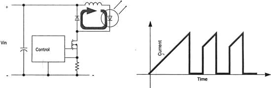 最簡單的開關穩壓器是圖2所示的降壓穩壓器,輸入電壓與LED電壓之間的壓差對電感L充電,電流隨之增加,當電流達到預設的值時,控制電路將串聯的晶體管關閉,在LED通路形成一個交變電流。注意,在LED驅動應用中,開關穩壓電路控制電流的峰值。