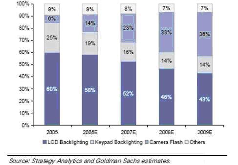 可拍照手機有取代傳統(tǒng)中低端數(shù)碼相機的趨勢,并且消費者期望能夠在低光照亮度的條件下拍攝高質(zhì)量的照片,因而采用Flash LED作為閃光燈是提高數(shù)碼相機性能的重要措施。Flash LED的光學(xué)特性決定它既可以作為拍照的閃光應(yīng)用,也可以用于視頻拍攝時補光,甚至是用于照明的電筒應(yīng)用。因此Flash LED在手機中的應(yīng)用將會越來越普遍,表1為Flash LED作為閃光燈在手機LED應(yīng)用中的比例走勢。