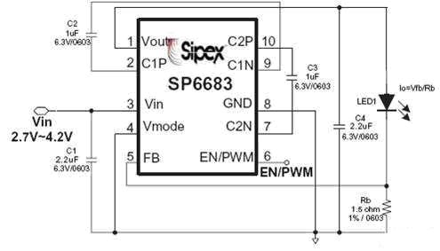 SP6682/3是采用恒流控制技術(shù)的電荷泵器件,F(xiàn)B反饋電壓為300mV,從而減少反饋電阻上的損耗,可選擇0603封裝電阻,負(fù)載端的效率比恒壓輸出方案的高,閃光的最大電流由公式2決定: