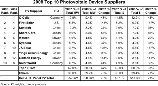 - 2008年全球太陽能電池單元和面板市場規模為比上年增加70%的6.0GW