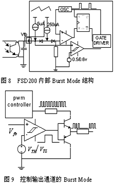 而FSD200則是通過控制內(nèi)部驅(qū)動(dòng)器實(shí)現(xiàn)可控脈沖模式,即將Vfo 腳的反饋電壓與0.6V/0.5V遲滯比較器比較,由比較結(jié)果控制門極驅(qū)動(dòng)輸出,其結(jié)構(gòu)可見圖8。我們可根據(jù)此原理用分立元件實(shí)現(xiàn)普通芯片的BurstMode功能,即檢測(cè)次級(jí)電壓判斷電源是否處于待機(jī)狀態(tài),通過遲滯比較器,控制芯片輸出,電路如圖9所示。