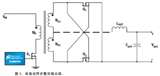 自驅動方案是最簡單、直接的SR驅動方案(圖3),適合于那些在任何時間段內變壓器電壓都不為零的拓撲結構。兩個SRFET可替代輸出整流二極管,次級繞組產生的電壓驅動SR的柵極。在大多數情況下,利用不同的變壓器線圈匝數比(NP∶NS1∶NS2)和正確選擇SRFET,相同的拓撲結構可以獲得更高或更低的輸出電壓。
