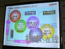 圖4:三洋電機移動能源公司業(yè)務(wù)開發(fā)統(tǒng)括部統(tǒng)括部長雨堤徹 圖5:通用圓筒形單元(18650)的產(chǎn)品陣容。根據(jù)用途區(qū)分使用