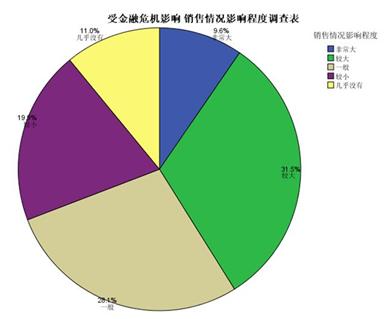 受金融危機的影響,銷售情況影響程度非常大的公司比重占9.6%,影響較大的為31.5%,幾乎沒有影響的只有11.0%(如下圖:受金融危機影響銷售情況影響程度調(diào)查表)。