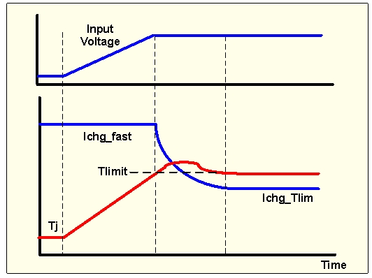 為解決此類散熱問題,可添加一個散熱環(huán)路,以降低充電電流并確保IC結(jié)點(diǎn)溫度低于熱關(guān)斷閾值。為bq2406X系列線性充電器添加了散熱環(huán)路的運(yùn)行如圖2所示。散熱環(huán)路在激活狀態(tài)下可有效降低充電電流,降低充電器級功率MOSFET的功耗。