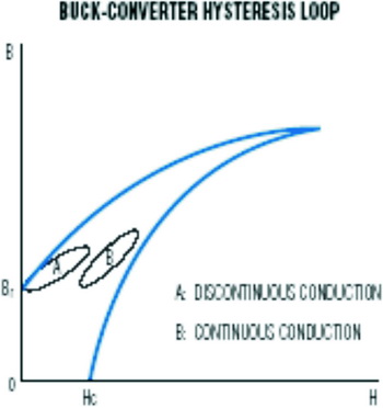 磁芯損耗主要是由于磁滯現象以及磁芯內部傳導率或其他非線性參數的互感產生。在Buck拓撲結構中,第一象限的B-H磁滯回線對磁芯損耗影響最大。在第一象限這個局部圖中,磁滯回線顯示了電感從初始電感量過渡到峰值電感量再回到初始電感量的過程。如果開關電源穩定工作在不連續狀態,磁滯回線會從剩余電感量(Br)過渡到峰值電感量(參考圖1)。如果開關電源工作在連續狀態,那么磁滯回線將會從直流偏置點上升到曲線峰值,再回到直流偏置點。通過實驗可以確定磁滯回線的精確曲線形狀(基本上是橢圓曲線)。