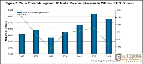 據iSuppli公司,繼2009年經濟成長放緩之后,預計未來幾年中國電源管理IC(PMIC)市場將強勁擴張,吸引更多的國內企業加入。