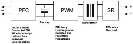 脈寬調制級(PWM)是主要的轉換器級。其中DC電壓被斬波為更高頻率的方波,因此利用更小的變壓器就可以轉換到另一個電壓級并提供隔離。并非所有的拓撲都采用占空比變化的方波,有些拓撲采用的是變頻,還有的則是改變兩個脈沖序列之間的相位。這一級主要確定轉換器的效率和負載調節。轉換器效率十分重要,首先它關系電源的運行成本;其次是必須通過機箱冷卻來散除產生的熱量;第三是熱組件越大,就越昂貴,占用空間也越大。這三個因素與電源的使用壽命成本關系重大。