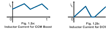 升壓電路可操作于二種模式,連續導通模式(ContinuousConductionMode;CCM)或不連續導通模式(DiscontinuousConductionMode;DCM),這二種模式是由電感電流的波形決定的。圖2a為CCM升壓電路的電感電流波形,圖2bDCM升壓電路的電感電流波形。