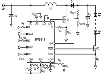 HV9911為CloseLoop,PeakCurrentControl,SwitchingModeLED驅動電源控制IC,它內建了許多功能來客服升壓電路的缺點。HV9911包含了9-250VDC輸入電壓穩壓器,不需額外電源,僅由單一輸入電壓提供IC動作的工作電源。它內建了2%精密的參考電壓(全溫度范圍)能精確地控制LED串聯電流。并且包含了斷路用的FET驅動電路。當輸出短路或過電壓時,便會自動斷開LED串之對地路徑。此功能縮短了控制電路的反應時間(請參考PWM調光電路說明)。(圖3)