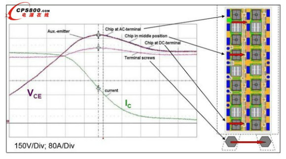 最后一點值得考慮的是新SKiM模塊的內部機械設計。圖6顯示了標有芯片位置的陶瓷襯底的布局。要注意布局的高度對稱性。在右側可以看到同時也扮演機械壓接系統角色的內部功率母線。層狀母線和流經每個芯片的電流直接使得DC+和DC端子之間的雜散電感不到20nH。至于IGBT的關斷,對于不同位置的芯片,沒有發現任何的差別。