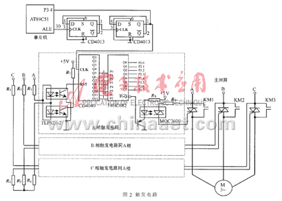 觸發(fā)角的計(jì)算:令計(jì)1個(gè)數(shù)的時(shí)間為t1,則t1=16/(250×103)s,設(shè)觸發(fā)角α占1個(gè)周期內(nèi)的時(shí)間段為t,則該觸發(fā)角對(duì)應(yīng)單片機(jī)P2口的十進(jìn)制數(shù)γ=t/t1。將γ傳送至單片機(jī)P2口,則可控制雙向晶閘管在電源電壓的正、負(fù)半波對(duì)應(yīng)α角時(shí)被觸發(fā)導(dǎo)通。B、C二相晶閘管的觸發(fā)原理同A相。