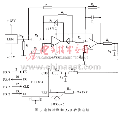 軟起動(dòng)的主要任務(wù)是控制主電路的電流,因此要對(duì)電流進(jìn)行檢測(cè)和監(jiān)控。電流檢測(cè)和A/D轉(zhuǎn)換電路如圖3所示。本裝置采用LEM電流傳感器進(jìn)行主回路電流的檢測(cè),其主要優(yōu)點(diǎn)是LEM電流傳感器可以測(cè)量任意波形的電流及瞬態(tài)峰值,副邊電流能真實(shí)地反映原邊電流的波形,原邊電路與副邊電路之間完全絕緣,可靠性高,而且動(dòng)態(tài)性能好,精度高,因此能夠很好地滿足工業(yè)現(xiàn)場(chǎng)應(yīng)用的需要。為減小誤差保證轉(zhuǎn)換精度,沒有采用傳統(tǒng)的橋式二極管整流電路對(duì)LEM模塊輸出的電流進(jìn)行整流,而是采用由2個(gè)運(yùn)放組成的精密全波整流電路進(jìn)行整流并濾波,得到與交流電流成比例變化的0~5V的直流電壓信號(hào)送入A/D轉(zhuǎn)換器TLC0834轉(zhuǎn)換成二進(jìn)制數(shù)送入單片機(jī),以此信號(hào)作為改變晶閘管觸發(fā)角大小的依據(jù),并用于數(shù)碼管顯示。TLC0834是8位串行控制模數(shù)轉(zhuǎn)換器,以5V作為基準(zhǔn)電壓,通過與控制處理器相連的串行數(shù)據(jù)鏈路傳送控制命令,用軟件對(duì)通道選擇和輸入端進(jìn)行配置。多路器尋址通過TLC0834的DI端移入轉(zhuǎn)換器。TLC0834的DI、CLK、DO和/CS分別與單片機(jī)的P3.2、P3.3、P3.6和P3.7端口連接。程序中置/CS為低,使TLC0834能夠工作,并對(duì)轉(zhuǎn)換器初始化;然后從處理器接收1個(gè)時(shí)鐘,在每個(gè)時(shí)鐘的上升跳變時(shí),DI端的數(shù)據(jù)移入多路器地址移位寄存器。在轉(zhuǎn)換過程中,轉(zhuǎn)換數(shù)據(jù)同時(shí)從DO端輸出。這樣TLC0834將輸入電壓轉(zhuǎn)換成二進(jìn)制數(shù)送入單片機(jī)后進(jìn)行處理和顯示。