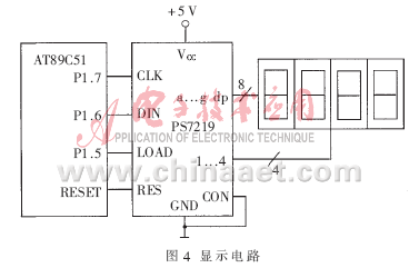 顯示電路如圖4所示,由高性能的多位LED顯示驅(qū)動(dòng)器PS7219控制。PS7219內(nèi)部具有15×8BRAM功能控制器寄存器,尋址方便;其復(fù)位引腳與單片機(jī)的復(fù)位端連接,LOAD、DIN和CLK端分別與單片機(jī)的P1.5、P1.6和P1.7端口連接。LOAD腳的功能是裝載數(shù)據(jù)輸入,當(dāng)它為高電平時(shí),串行輸入數(shù)據(jù)的最后16位被鎖定。串行數(shù)據(jù)的傳送格式為D15~D0,其中D15~D12為無關(guān)位,D11~D8為寄存器地址,D7~D0為數(shù)據(jù)位;DIN腳的功能是串行數(shù)據(jù)輸入,發(fā)送到DIN端的16位數(shù)據(jù)在每個(gè)CLK的下降沿被移入到內(nèi)部16位寄存器中;然后,在LOAD的上升沿,數(shù)據(jù)被鎖存到數(shù)值或控制寄存器中。