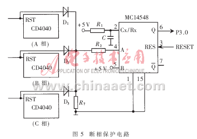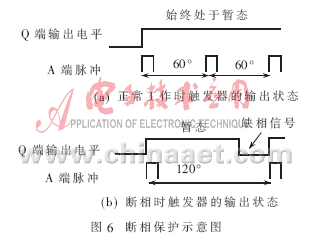 斷相是對(duì)電動(dòng)機(jī)危害較大的一種故障,為此系統(tǒng)單獨(dú)設(shè)置了如圖5所示的斷相保護(hù)電路,主要由摩托羅拉單穩(wěn)態(tài)觸發(fā)器MC14548和3只二極管組成的“或門”電路實(shí)現(xiàn)。斷相保護(hù)示意圖如圖6所示。MC14548由上升沿觸發(fā),產(chǎn)生1個(gè)脈寬由外加定時(shí)元件電阻R1和電容C決定的輸出脈沖。當(dāng)MC14548的A端出現(xiàn)1個(gè)上升沿、B端為高電平時(shí),Q端(平時(shí)輸出低電平)輸出1個(gè)由低到高的脈沖,經(jīng)過時(shí)間τ(τ=R1×C)后從高變低。分別來自A、B、C相觸發(fā)電路中計(jì)數(shù)器CD4040的RST端的3個(gè)信號(hào)經(jīng)“或門”電路與MC14548的A端相連。因三相電源電壓相位互差120°,故接入A、B、C三相回路的3個(gè)雙光耦TLP521每60°就有1次過零,過零時(shí)3個(gè)計(jì)數(shù)器CD4040的RST端一定有1個(gè)呈高電平,經(jīng)過“或門”后MC14548的4腳每60°就有1個(gè)上升沿脈沖。若設(shè)定時(shí)間常數(shù)τ的值在大于60°而小于120°所對(duì)應(yīng)的時(shí)間為:3.3ms<τ<6.6ms,則不缺相時(shí),單穩(wěn)態(tài)觸發(fā)器將始終處于暫態(tài),MC14548的Q端始終輸出高電平,此時(shí)觸發(fā)器的工作狀態(tài)如圖6(a)所示;若斷相,MC14548的A端將出現(xiàn)隔120°才出現(xiàn)下一個(gè)脈沖的情況,此時(shí)MC14548的Q端將從暫態(tài)回到穩(wěn)態(tài),呈現(xiàn)低電平,此時(shí)觸發(fā)器的工作狀態(tài)如圖6(b)所示。將MC14548的Q端連至單片機(jī)的P3.0端口,由程序檢查P3.0端口,如為零則說明斷相,然后進(jìn)行斷相處理。