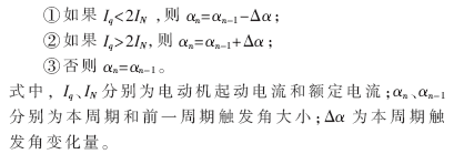 (3)軟起動(dòng)模塊:根據(jù)電動(dòng)機(jī)電流檢測(cè)信號(hào),經(jīng)單片機(jī)分析和處理后得到當(dāng)前晶閘管觸發(fā)角的大小,以實(shí)現(xiàn)電機(jī)的限流起動(dòng)。以起動(dòng)電流限定為2倍的額定電流為例,觸發(fā)角控制算法如下: