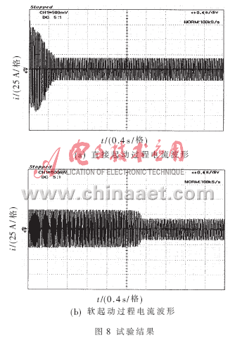 圖8為電機(jī)起動(dòng)過程實(shí)測(cè)電流波形,圖8(a)為直接起動(dòng)過程電流波形,圖8(b)為軟起動(dòng)過程電流波形。可見整個(gè)軟起動(dòng)過程中電流的變化很平穩(wěn),沒有出現(xiàn)振蕩現(xiàn)象,電機(jī)軟起動(dòng)時(shí)的起動(dòng)電流是其穩(wěn)定運(yùn)行電流的2倍左右,而直接起動(dòng)非常迅速,啟動(dòng)電流很大,直接起動(dòng)時(shí)的起動(dòng)電流是其穩(wěn)定運(yùn)行電流的5~7倍。試驗(yàn)結(jié)果表明,所設(shè)計(jì)的軟起動(dòng)器系統(tǒng)效果良好,起動(dòng)過程平穩(wěn),無沖擊和振蕩。