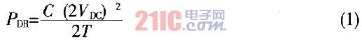 電容C的大小不僅影響集電極電壓的上升速度,而且決定了電阻R上的能量損耗。在Q關(guān)斷瞬間,C上的電壓為2Vdc,它儲存的能量為0.5C(2Vdc)2焦耳。如果該能量全部消耗在R上,則每周期內(nèi)消耗在R上的能量為: