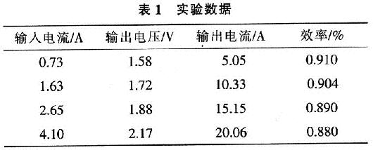 實驗中用50A的2個二極管串聯作為負載,輸入電壓12V時,不同電流下輸出及效率如表1所示。