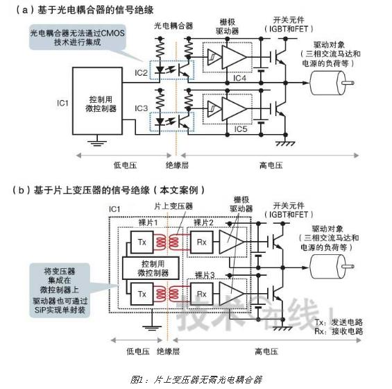 在絕緣型開關電源和交流馬達的驅動電路中,PWM信號等的絕緣一直使用光電耦合器(a)。如果能夠使用片上變壓器的話,就可以集成在微控制器上,因此可以大幅削減部件個數(b)。圖是根據瑞薩電子的資料制作而成的。