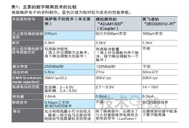 美國模擬器件(ADI)、美國芯科實驗室(Silicon Laboratories)以及德國英飛凌科技(Infineon Technologies)等已經使采用片上變壓器的隔離器實現了實用化。此次技術與這些現有技術的不同之處在于,考慮到要集成在廉價的微控制器上,將變壓器的面積減小到了原來的1/4左右。具體情況是,通過電路技術的改進,將原來需要500μm左右的變壓器直徑降至230μm(表1)。