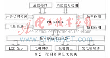 智能型雙電源開關控制器以單片機PIC16F884為核心,對兩路供電電源(常用電源和備用電源)的電壓、頻率和相位進行實時檢測。當其中一路電源(常用電源或備用電源)的電壓發生過壓、欠壓或是缺相時,控制器就會發出電機切換命令,使供電電源自動切換到另一路電源(備用電源或常用電源)上,以此來保障供電的連續性??刂破鞯墓ぷ鞣绞街饕凶詣臃绞胶褪謩臃绞絻煞N??刂破鞯慕Y構框圖如圖1所示,組成模塊如圖2所示。