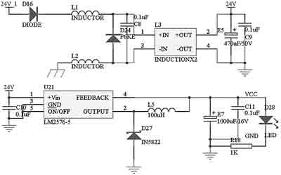 本控制模塊的電源電路如圖2所示。車載蓄電池—發電機的電源從24V_1處進入,二極管D16主要是防止電源的正負極被誤接反。電感L1、L2對電源進行濾波,和共模電感L3、電容C8配合,可以過濾掉電源中的尖峰脈沖。二極管D24P6KE51A是脈沖干擾抑制器(TVS),它可以快速吸收超過額定電壓的尖峰脈沖,瞬時通過電流很大,最大功率可達500~1000W。電容E5和C9進一步對電源進行濾波。過濾干凈的電流通過開關電源芯片LM2576變換為系統使用的5V電源。電容E7和C11對輸出5V電源進行濾波,電阻R18和發光二極管D28指示當前是否有電。