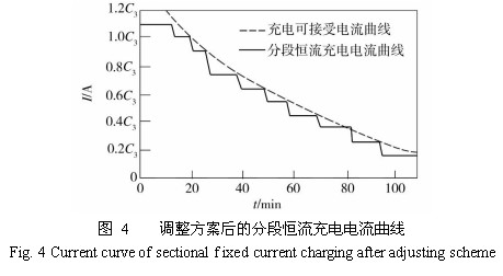 根據調整后的分段恒流充電方案進行充電試驗 ,為便于比較 ,采用與方案調整前的充電試驗所用同一型號電池 ,充電初始狀態完全一樣。調整方案后的定流充電各階段的控制參數和充入的電量如表 3 所示 ,其定壓充電階段的控制參數和充入的電量與表的分段恒流充電電流曲線如圖 4 所示。