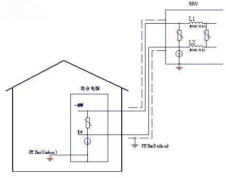 注:① 如果組合電源內(nèi)部沒有配置合適的直流防雷器,則應(yīng)該在RRU電源線引出機(jī)房處加裝一級(jí)直流防雷箱;