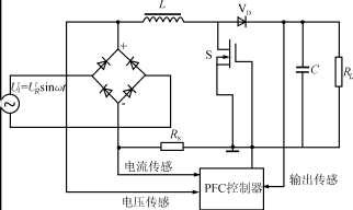 開關(guān)電源的功率因數(shù)校正器(PFC)可分為兩類,一類為有源PFC,由電感電容及電子元器件組成;另一類為無源PFC,一般采用電感補償方法使交流輸入的基波電流與電壓之間相位差減小來提高功率因數(shù)。在校正電路中有源PFC較多采用高頻升壓電路功率因數(shù)開關(guān)調(diào)節(jié)器,通常采用Boost電路,基本電路拓樸見圖1。