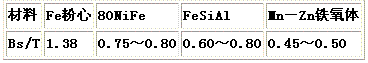 目前扼流圈鐵心使用的材料主要有兩類,一類是功率鐵氧體磁心加開氣隙,另一類是磁粉心。表1是它們的飽和磁感應(yīng)強(qiáng)度(Bs)的比較,其中錳鋅軟磁鐵氧體Bs值最低,為0.5T,約為鐵粉心的一半左右,因此在同樣安匝數(shù)下和鐵粉心相比截面將增加1倍左右,因而體積勢必增大。