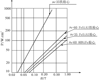 關(guān)于磁粉心在PFC電感中的應(yīng)用,已被很多電源工作者所認(rèn)可。目前磁粉心材料大致有鐵粉心,Sendust粉心(FeSiAl),坡莫合金粉心(P.P.M),從損耗曲線上可以看出,P.P.M(μe=60)及Sendust(μe=60)和鐵粉心(μe=35)相比,前二者約為后者的1/10~1/6,因此,鐵粉心可以排除,無法用作PFC電感材料,除非大大增加體積,降低工作B值。