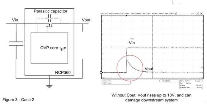 在圖3的案例2中,輸出電容已被移除。這樣,當OVP器件輸入端出現快速輸入瞬態現象時,旁路元件將保持開路。這時可以在輸出端觀察到過 沖,這個過沖可能會損壞連接至OVP輸出端的電子元器件。為了解決這個問題,必須在輸出引腳上連接一個輸出電容,并盡量靠近OVP器件擺放。