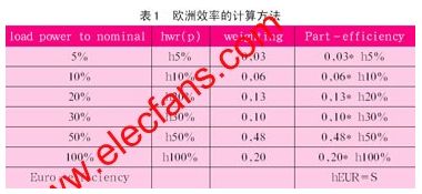 因此為了提高光伏逆變器的歐洲效率,僅僅降低額定負載時的損耗是不夠的,必須同時提高不同負載情況下的效率。歐洲效率是一個新的參數,主要是針對光伏逆變器提出來的。由于太陽光在不同時間,強度是不一樣的,所以光伏逆變器其實并不會一直工作在額定功率下,更多的是工作在輕負載的時候。所以衡量光伏逆變器的效率,不能完全以額定功率下的效率來衡量。所以歐洲人就想出來了一個新的參數–歐洲效率來衡量。歐洲效率的計算方法如表1。