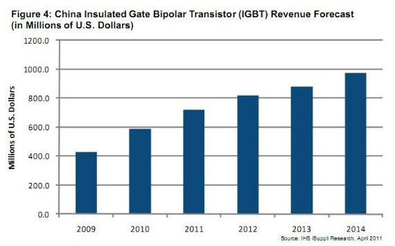 隨著中國高鐵、地鐵、動車、風(fēng)力發(fā)電、光伏發(fā)電、電動/混合動力汽車等領(lǐng)域的快速發(fā)展,市場對IGBT及其模塊的需求越來越大。據(jù)IHS iSuppli公司的研究,由于工業(yè)與消費(fèi)領(lǐng)域的需求增長,中國絕緣柵雙極型晶體管(IGBT)市場未來幾年將快速增長,2014年銷售額將從2009年的4.297億美元上升到9.75億美元,增長一倍以上。