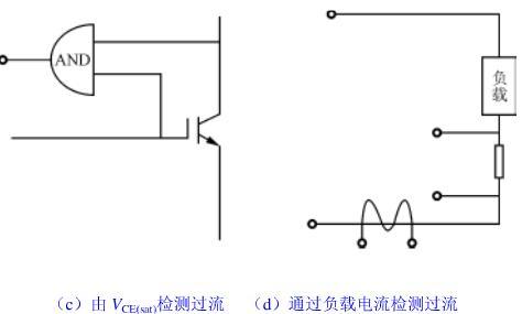 此方法與圖5(a)中的檢測(cè)方法基本相同,但圖5(a)屬直接法,此屬間接法,如圖5(d)所示。若負(fù)載短路或負(fù)載電流加大時(shí),也可能使前級(jí)的IGBT的集電極電流增大,導(dǎo)致IGBT損壞。由負(fù)載處(或IGBT的后一級(jí)電路)檢測(cè)到異常后,控制執(zhí)行機(jī)構(gòu)切斷IGBT的輸入,達(dá)到保護(hù)的目的。