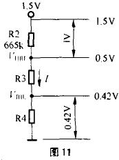 溫度傳感器采用NTC熱敏電阻RT,已知RT在0℃時(shí)阻值為333.1kΩ;5℃時(shí)阻值為258.3kΩ,則按1.5V工作電壓及流過R1、RT的電流約1.5 uA,可求出R1的值。R1的值確定后,可計(jì)算出0℃時(shí)的VA值為0.5V(按圖10中R1=665kΩ時(shí)),5℃時(shí)的VA值為0.42V,則VTHL=0.42V,VTHH=0.5V。若設(shè)R2=665kΩ,則按圖11,可求出流過R2、R3、R4電阻的電流I=(1.5V-0.5V)/665kΩ=0.0015mA,按R4×I/=0.42V,可求出R4=280kΩ再按0.5V=(R3+R4)0.0015mA, 則可求出R3=53.3kΩ。