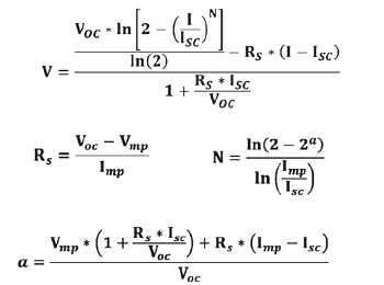 為了能夠精確仿真太陽能電池板在特定環境條件下的輸出(特別是對于小功率逆變器,仿真精度的要求往往更高),很多廠家推出了專用的太陽能方陣模擬器,用于模擬各種環境下太陽能電池板的輸出特性,精確地復現出不同環境條件下的I-V輸出特性曲線。I-V曲線的數據多來自于用戶對太陽能電池板輸出的實際測量結果。為了簡化操作,目前國際上通用的曲線設置方式是:通過I-V曲線上的四個特征值,即Voc(開路電壓值)、Isc(短路電流值)、Vmp(最大功率點電壓值)、Imp(最大功率點電流值)來擬合得到完整的I-V曲線。所使用到的公式如下所示:
