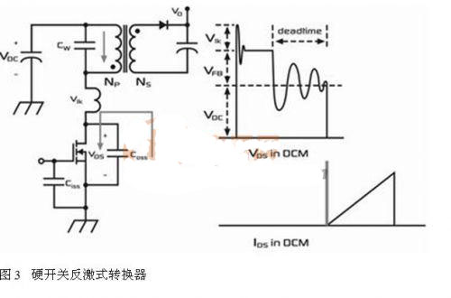 圖3示出傳統硬開關反激式轉換器。在這種傳統的間斷模式反激式轉換器 (DCM) 的停滯時間期間,寄生電容將與VDC周圍的主要電感發生振蕩。寄生電容上的電壓會隨振蕩而變化,但始終具有相當大的數值。當下一個時鐘周期的MOSFET 導通時間開始時,寄生電容 (COSS和CW) 會通過MOSFET放電,產生很大的電流尖峰。由于這個電流出現時MOSFET存在一個很大的電壓,該電流尖峰因此會做成開關損耗。此外,電流尖峰含有大量的諧波含量,從而產生EMI。[page]